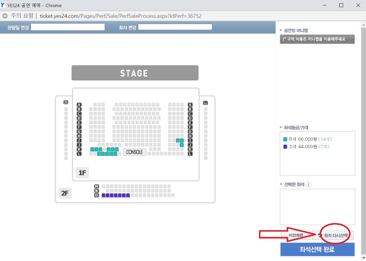 7월 16일 밤 12시 4분쯤 부터 예스 24의 취소표들이 풀린다. 이 사이트의 경우 폰으로 했을 때 새로고침을 어떻게 해야 하는지 애매할 수 있다. 달력 페이지로 나갔다가 들어왔다 할 수 있는데 이 방법의 경우 정신이 없기에 크게 선호하지 않는다. 그러면 PC로 하는 방법이 있는데, 개인적으로는 적은 표가 풀리는 만큼 한 번에 넓은 구역을 볼 수 있는 PC가 더 좋기는 한 것 같다. PC 화면 같은 경우에는 아래 사진에서 보여지는 것처럼 좌석 다시 선택 버튼으로 새로고침을 할 수 있다.