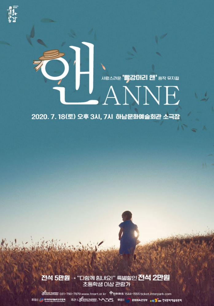 하남문화재단&극단 걸판 뮤지컬 <앤ANNE> 7.18(토) 오후 7시 앤은 참 특별해, 그렇지? “저 길 모퉁이를 돌면 분명 좋은 일이 펼쳐질꺼야!” 어린이들을 비롯한 어른들에게 유년 시절의 꿈과 사랑을