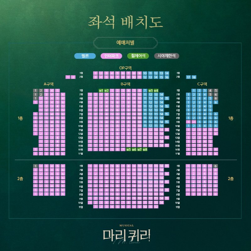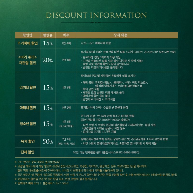 할인을 보면 조기예매 할인과 1차 때 티켓을 잡아 공연을 보고 또 볼 사람들이 쓸 수 있는 재관람 할인이 있다. 마티네는 수요일 낮 공연에 적용이 되고, 위의 표를 보고 본인에게 맞는 할인을 골라 예매를 하면 될 것 같다. 재관람 할인이 아예 없는 쇼노트 보다는 나아 보이지만, 좌석 배치도를 봤을 때 1층 전체를 R석으로 그것도 99,000원으로 가지고 온 걸 보면 거기서 거기 인 것 같다.