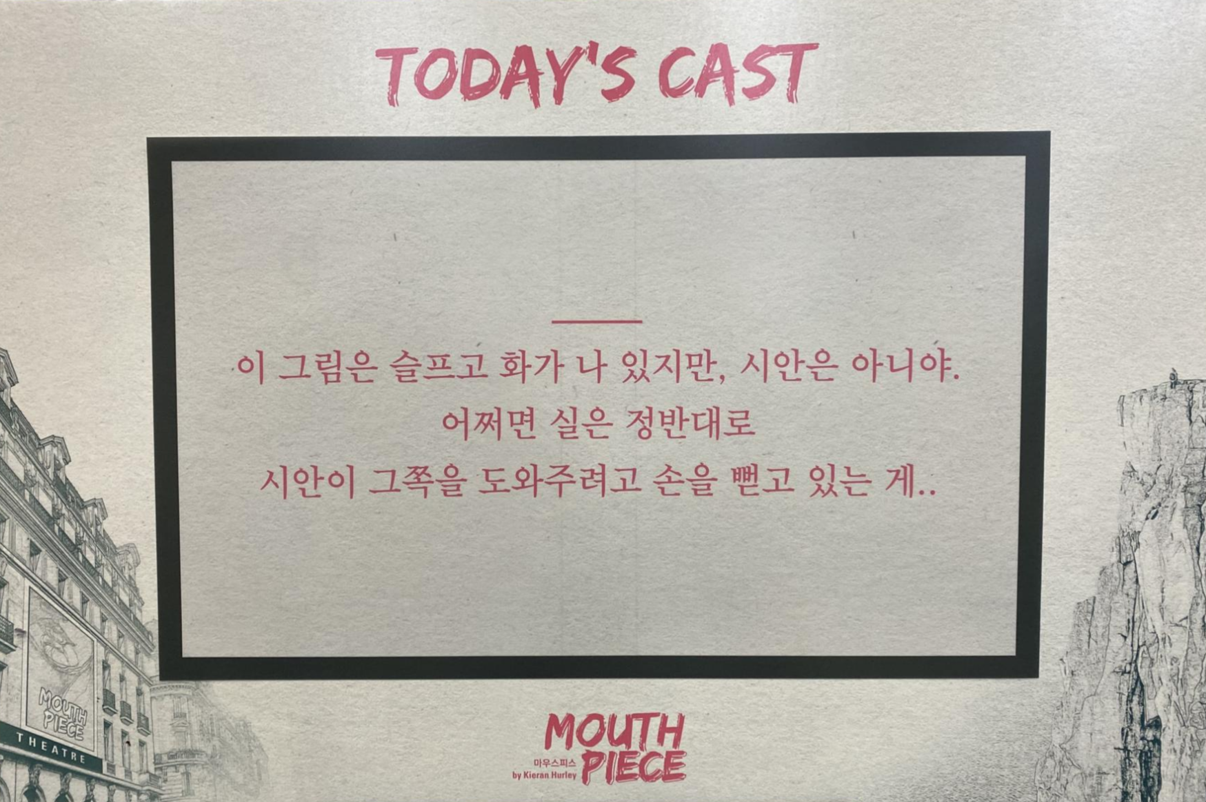 연극 마우스피스처럼 관객이 꼭꼭 꼭 필수라고 느끼게 하는 공연은 없었던 것 같다. 마지막 장에 데클란의 동의 없이 올려진 리비의 연극 마우스피스가 올라가고, 데클란은 그 공연장에서 리비를 만나기 위해 가는 데 순간 관객석의 조명도 살짝 밝아지면서 관객이 실제로 그 공연장에 데클란과 함께 앉아 있고, 한 명의 관객, 평론가, 기자가 되는 경험을 한다. 이게 너무나 자연스럽게 스며들어와서 깜짝 놀랐다. 거의 후반부로 갈수록 이유 모를 눈물이 계속 흘렀는데 이 후기를 쓰는 지금까지도 내가 왜 그렇게 울었을까? 명확한 이유를 아직 찾지 못했다.
