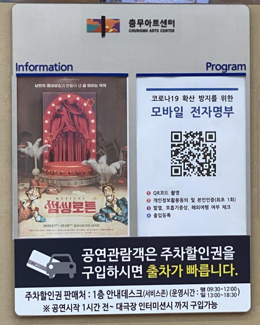 QR 코드를 이용한 모바일 문진표를 작성하고 있고, 객석 수표 시 보여주고 입장을 하면 된다. 주차를 하신 분이 있다면 1층 안내데스크에서 미리 할인권을 구입할 수 있다고 한다.
