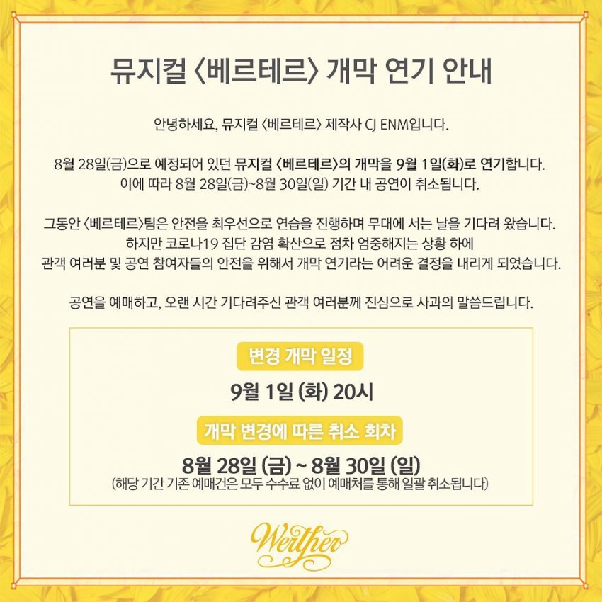 뮤지컬 베르테르의 제작사인 CJ 뮤지컬은 베르테르 뿐만 아니라 다른 공연들도 올리고 있기 때문에 한 번 정부 권고를 받게 되면 타격이 큰 상황이라 현재 제작하고 있는 모든 공연의 일부 회차는 취소를 하고, 9/6일 일요일까지 공연을 일괄 취소 뒤 거리두기 좌석제로 바꾼 뒤 재 오픈을 강행하기로 결정했다. 지난 월요일에 이 소식이 전해지고 많은 팬들이 아쉬움을 말하지만, 정부 정책과 건강이 우선이기 때문에 어쩔 수 없는 조치라고 생각한다.