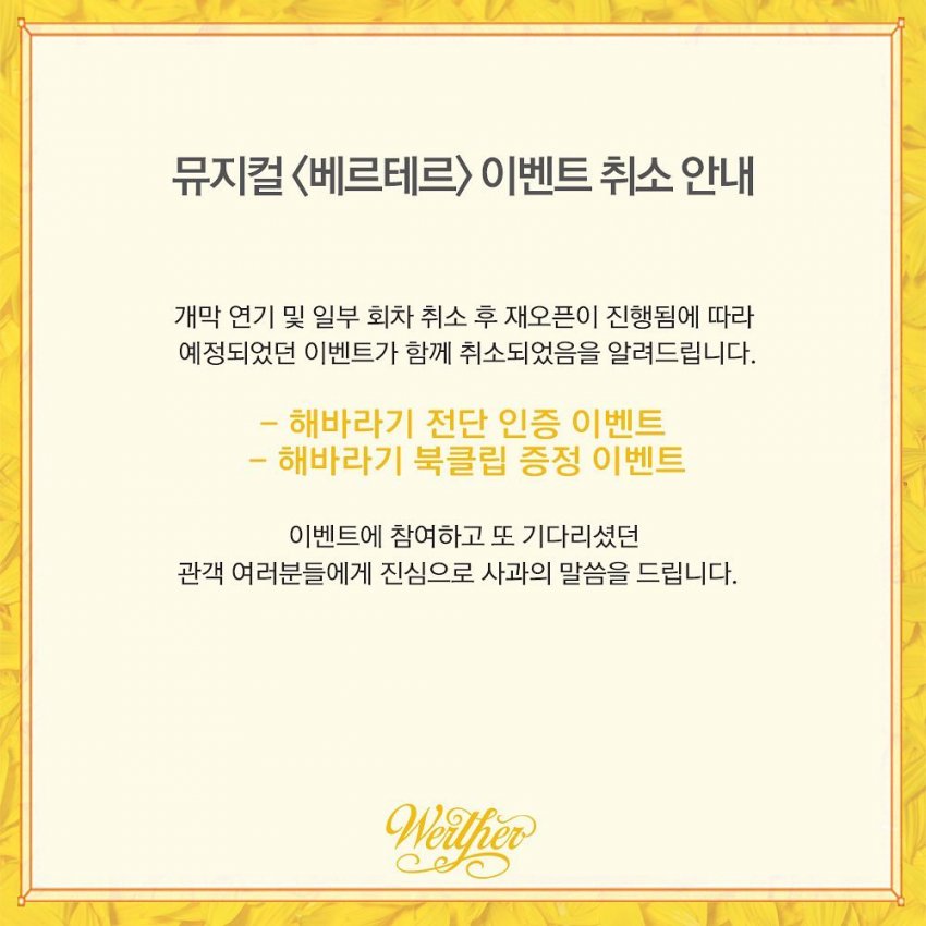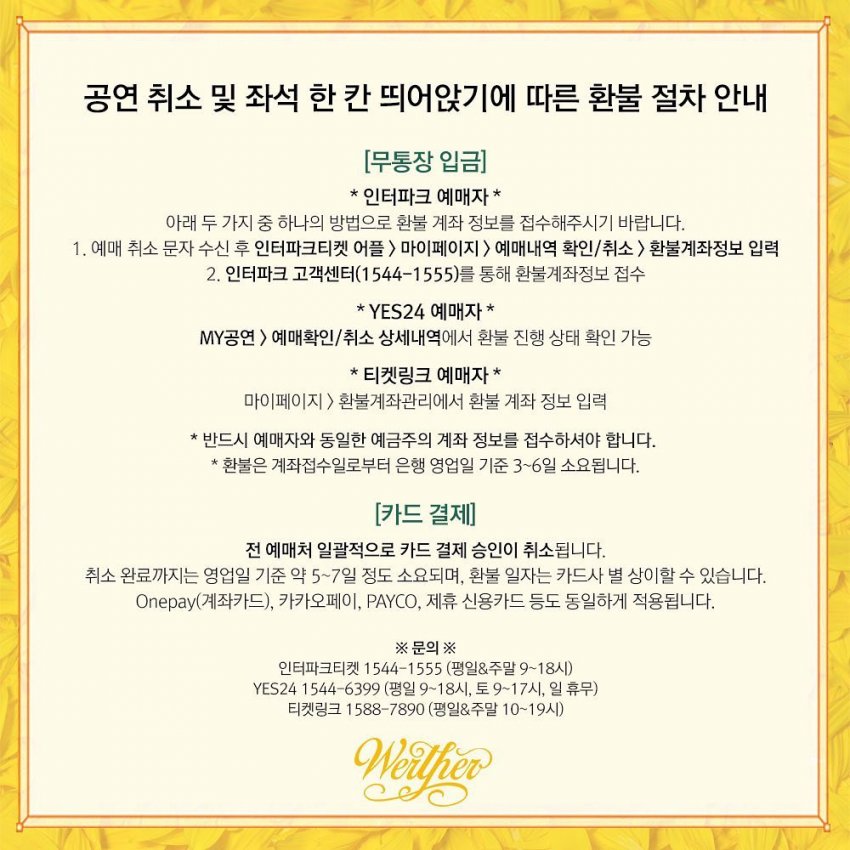 개막에 맞춰 해바라기 북클립을 전해 주는 이벤트는 취소가 되었다. 그리고 취소 된 회차의 환불 방법은 위의 공지사항에 잘 나와 있다. 취소가 됐다는 문자를 받기 전에 스스로 취소를 할 경우 취소 수수료가 붙으니 주의하기 바란다.