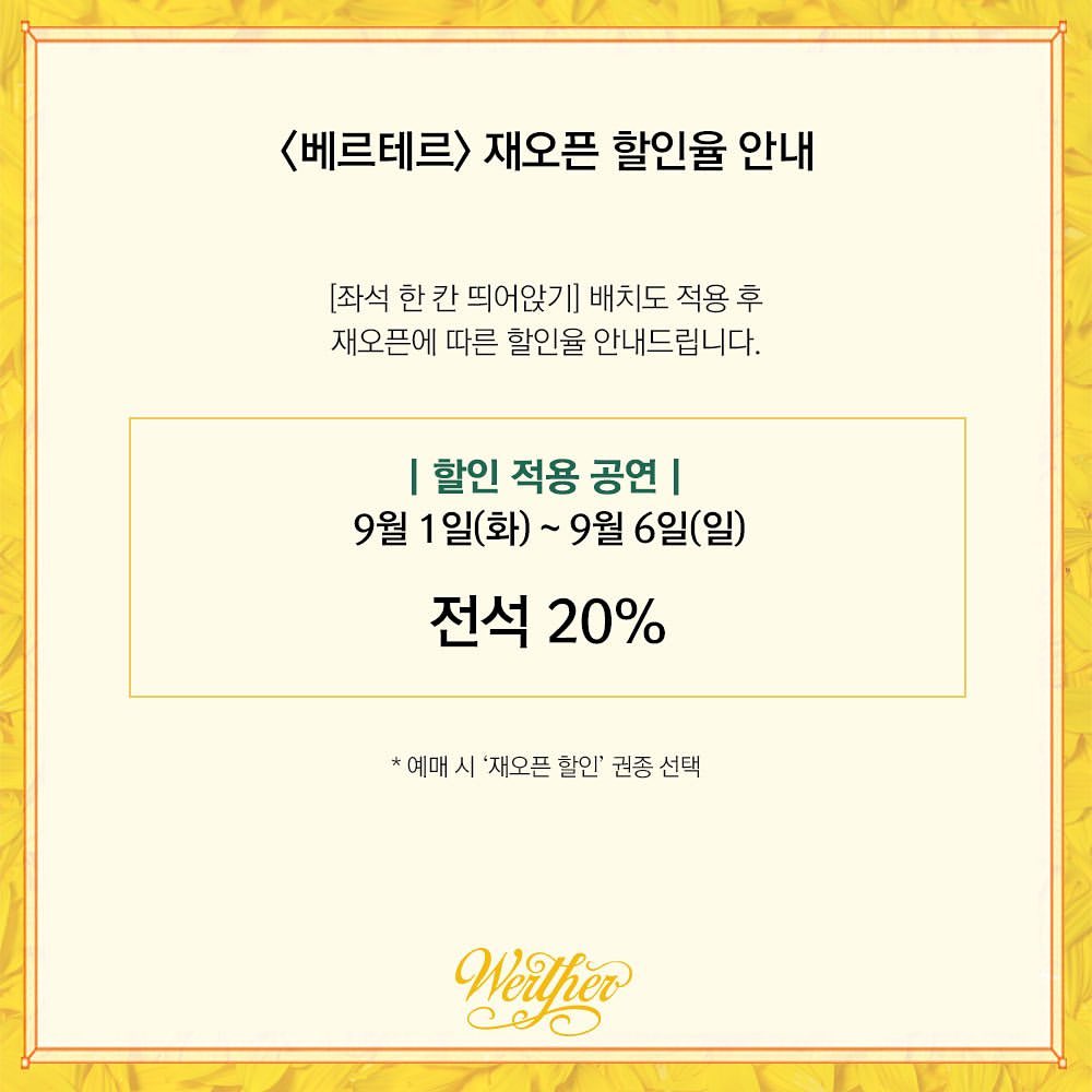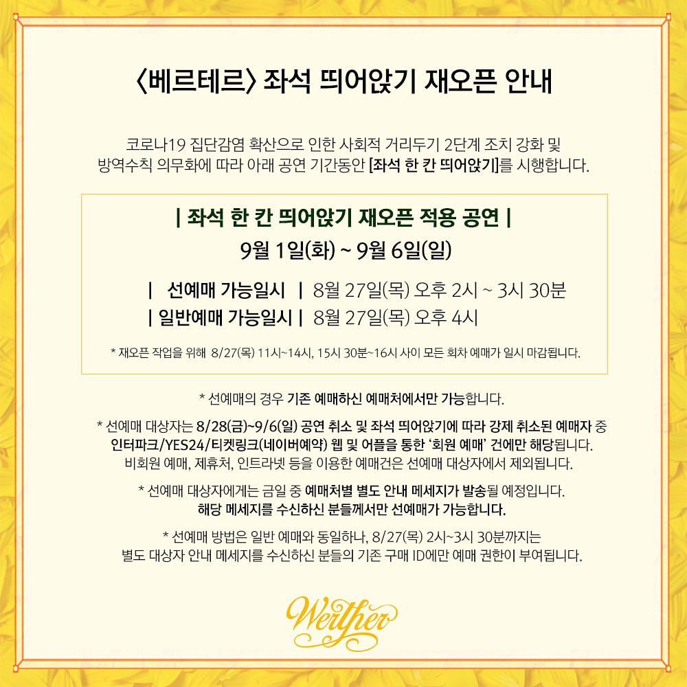뮤지컬 베르테르는 아직 공연 개막 전인데, 8월 28일 금요일에 예정 되어 있던 공연 개막 일정이 9월 1일 화요일로 변경이 되었다. 그래서 자동적으로 8월 28일 ~ 30일 일요일 회차는 자동 취소된다. 그리고 정부의 지침에 따라 좌석 간 거리두기제가 시행이 되는 데 이로 인해 9월 6일까지의 공연이 전체 취소가 되고 재오픈이 된다.
