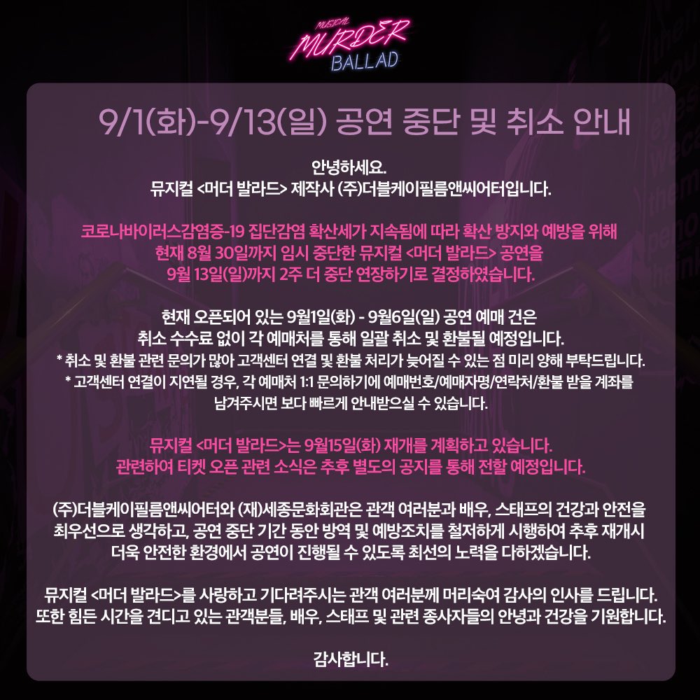 우선 지난 프리뷰 공연 이후 계속 쉬고 있던 [뮤지컬 머더 발라드]가 9월에 공연 재개를 목표로 하고 있었는 데 공연 중단 기간을 더 늘리기로 결정을 했다. [9/1 화요일 ~ 9/13 일요일]까지 공연이 중단된다. 현재 9/6일까지 공연이 오픈되었는데 이 기간 동안 예매를 한 사람은 자동으로 취소 수수료 없이 환불을 받을 수 있다. 카드 예매자는 자동 취소를 기다리면 되고, 무통장 입금 예매자는 취소 확인 문자를 받은 뒤 취소된 예매 페이지로 들어가 환불 계좌를 입력해주면 된다. 헷갈리는 경우에는 각 예매처의 고객센터로 전화를 해보면 되는데 현재 문의량이 많아서 그 연결이 매우 어려운 편이다.