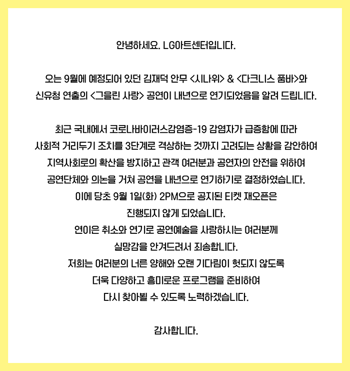 그리고 LG 아트 센터에서 올라 올 공연들이 대거 연기가 되었다. LG 아트 센터에서는 CoMPAS라고 해서 직접기획해 선보이는 다양한 시즌 공연들이 있다. 9월에 기대하고 있던 공연 중 하나인 신유청 연출의 [그을린 사랑] 또한 내년으로 연기 되었다. 원래는 티켓팅 날짜만 연기가 됐었는데 상황을 보니 좋아질 것 같아서 연기가 된 것 같다. 내년에 올라온다고 하는 데 내년에는 제발 상황이 좋아져 모두가 안전하고 편하고 즐겁게 공연 관람을 할 수 있었으면 좋겠다.