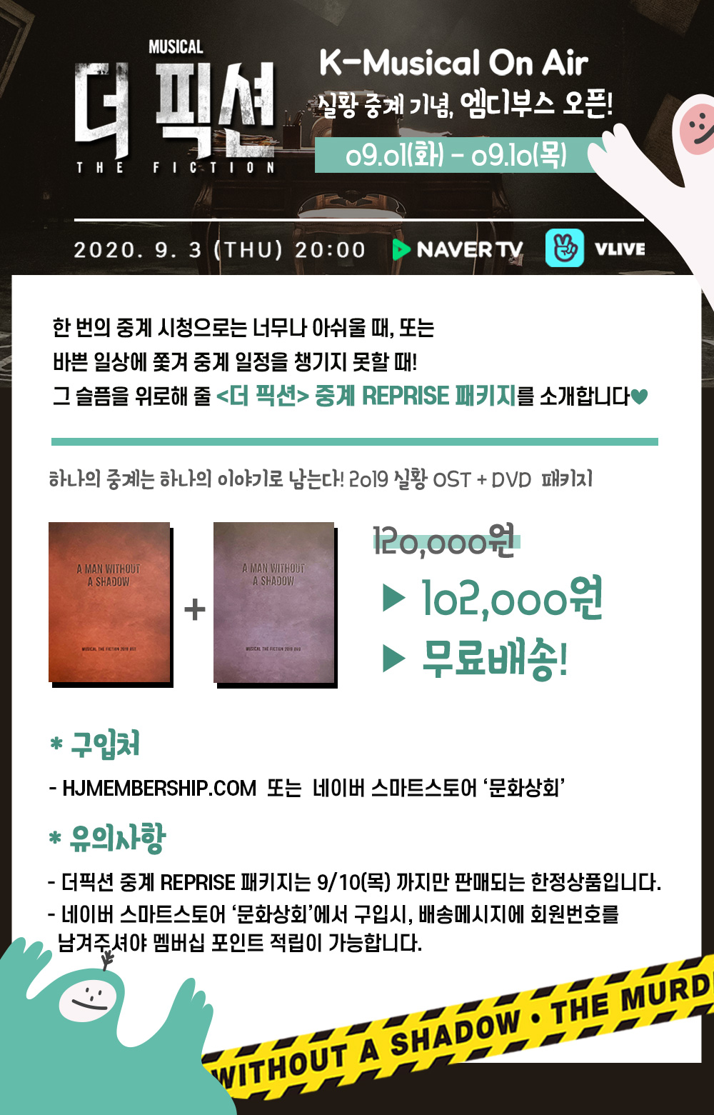 한국 관광 공사와 케이 뮤지컬 온 에어에서 하는 공연 중계방송의 마지막 날이었다. 8/31일 월요일부터 9/3일 목요일까지 4일간 매일 밤 8시마다 열심히 달렸다. 공연장에 가지 못하는 슬픔을 이렇게라도 해소할 수 있어서 정말 다행이었다. 마지막 날의 중계는 HJ Culture에서 제작한 더 픽션이라는 뮤지컬이었다. 2019년에 공연을 한 버전이라고 하는 데 그때 공연장에서 보지 못했던 기억이 있어서 이번 중계방송 중 가장 기다렸던 공연이었다.