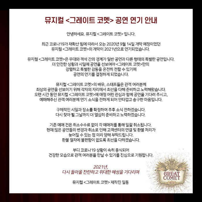 시국이 시국인지라 나름 각오하고 있던 소식이 오늘 오후에 있었다. 쇼노트에서 제작하는 국내에 처음 들어오는 라이선스 [뮤지컬 그레이트 코멧]이 개막 일정을 연기한다. 개막 전부터 새로운 형태의 뮤지컬이라고 많은 홍보를 해서 올 하반기 기대를 하고 있던 뮤지컬 중 하나인데 개막 일정이 미뤄져서 다행이다 싶으면서도 정말 아쉽다.