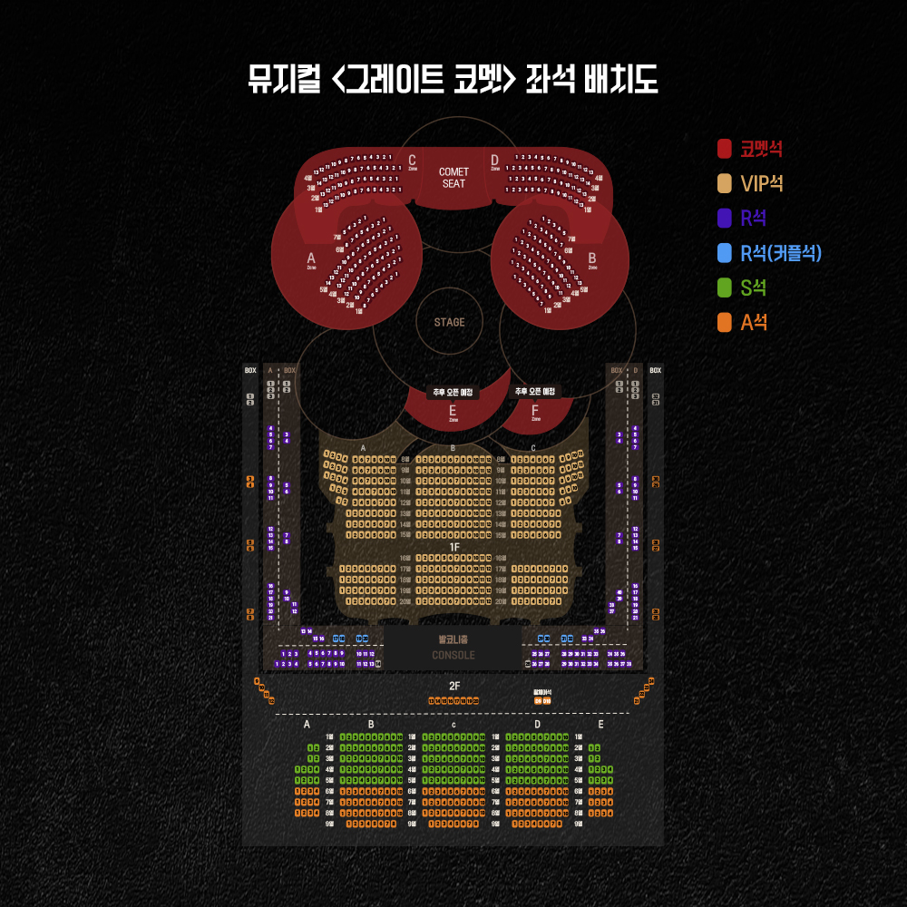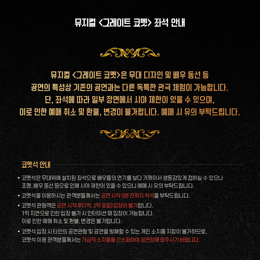 안 그래도 걱정이 되던 부분이 무대 석인 코멧석이었다. 위 배치도와 좌석 설명을 보면 코멧석이 어떻게 설치가 되어 있는지 알 수 있다. 그리고 브로드웨이 버전 공연을 찾아보면 이머시브 형식의 공연이라 배우와 관객들의 거리가 가깝고 접촉도 있다. 이머시브 형식의 공연은 무대와 객석의 거리가 없기 때문에 이 시기에 올라오기 힘들 거라고 생각했다. 아니나 다를까 이 부분 때문에 공연을 강행하기는 힘들다는 결정을 내린 것 같다.