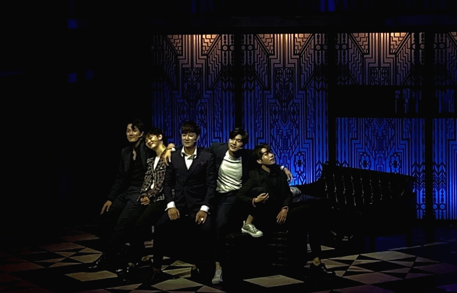 마지막 커튼콜은 촬영이 가능하다. 그래서 5명의 배우가 행복하게 앉아서 끝나는 장면을 한 컷 찍어 보았다. 이렇게 암전이 되고 난 뒤에 에필로그가 시작이 된다. 에필로그는 위에서 말한 내용이랑 같은데 조풍래 배우님 (알렉스役)이랑 김종구 배우님의 (마담=이재현役) 티키타카가 웃겼다. 왜 우리 박스는 잘되지 않는 걸까를 고민하며 한방을 만드는 데 여기서 본 공에 나온 누님들 앞에서 부르는 그 깜찍한 송이 탄생이 됐구나 했다.